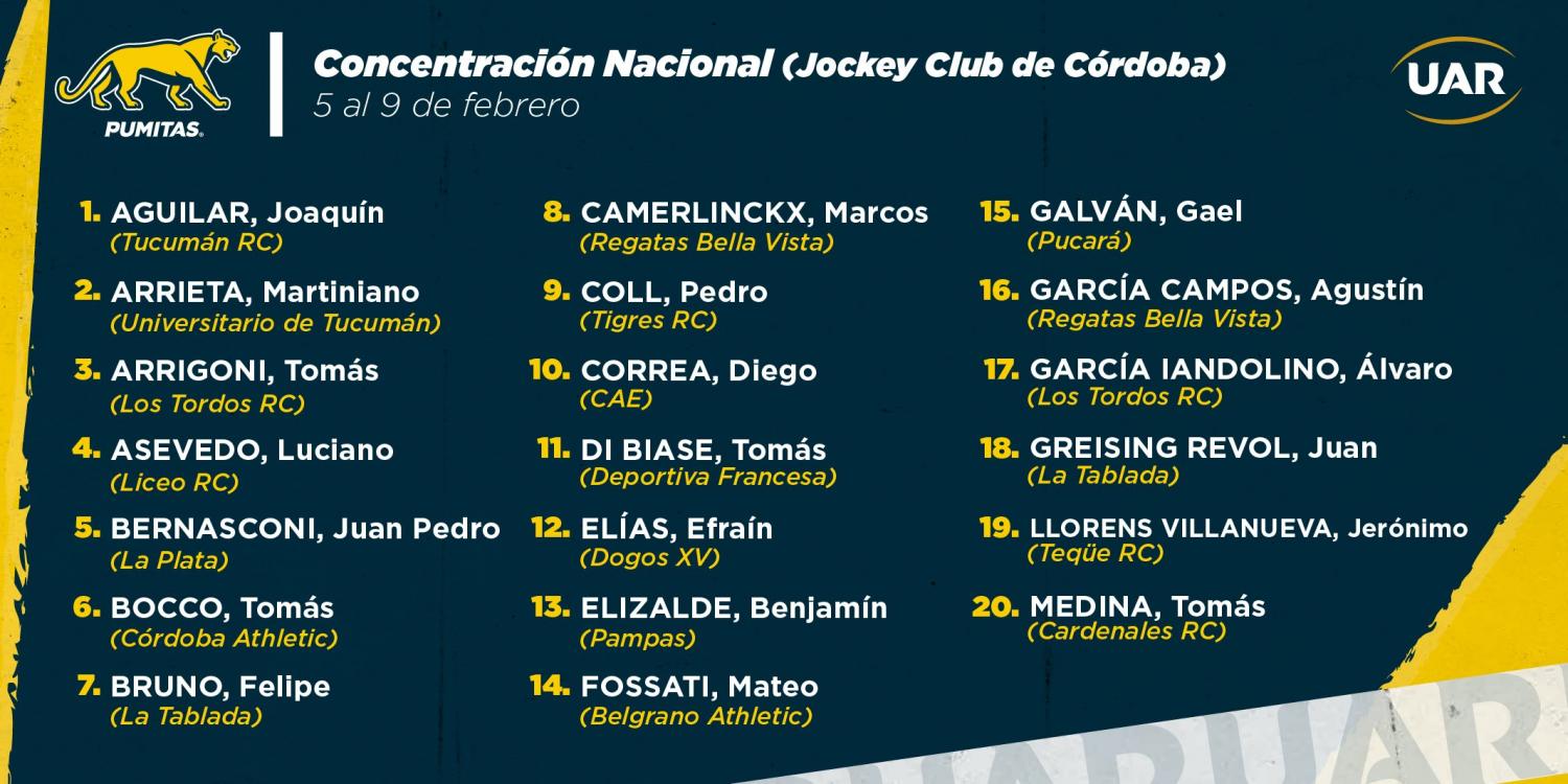 Dentro del listado de cuarenta jugadores que designó Alvaro Galindo, tenemos a cuatro tucumanos presentes, que vienen de formar parte de los equipos nacionales que participaron del sudamericano M-18 y M-19 del año pasado (en ambos, Los Pumitas fueron campeones). Entre los presentes, tenemos a: Joaquín Aguilar, tercera línea de Tucumán Rugby, Martiniano Arrieta, fullback de Universitario, Tomás Medina, centro de Cardenales, y Rafael O'gorman, win de Tucumán Rugby. Además, forma parte de la convocatoria el centro salteño Pedro Coll, de Tigres de Salta.
