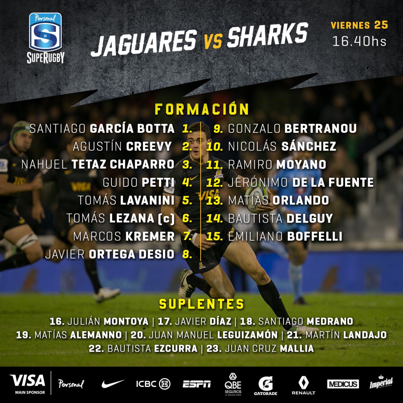 El próximo viernes Jaguares recibe a Sharks en el estadio de Vélez, en un partido clave en miras a la siguiente etapa. Ademas el equipo argentino querrá conmemorar el día de la patria sumando su sexta victoria al hilo. Los tres tucumanos que irán desde el comienzo son: Nicolás Sánchez, Matías Orlando y la vuelta de Ramiro Moyano al equipo. Mientras que Javier Díaz estará en el banco de suplentes.