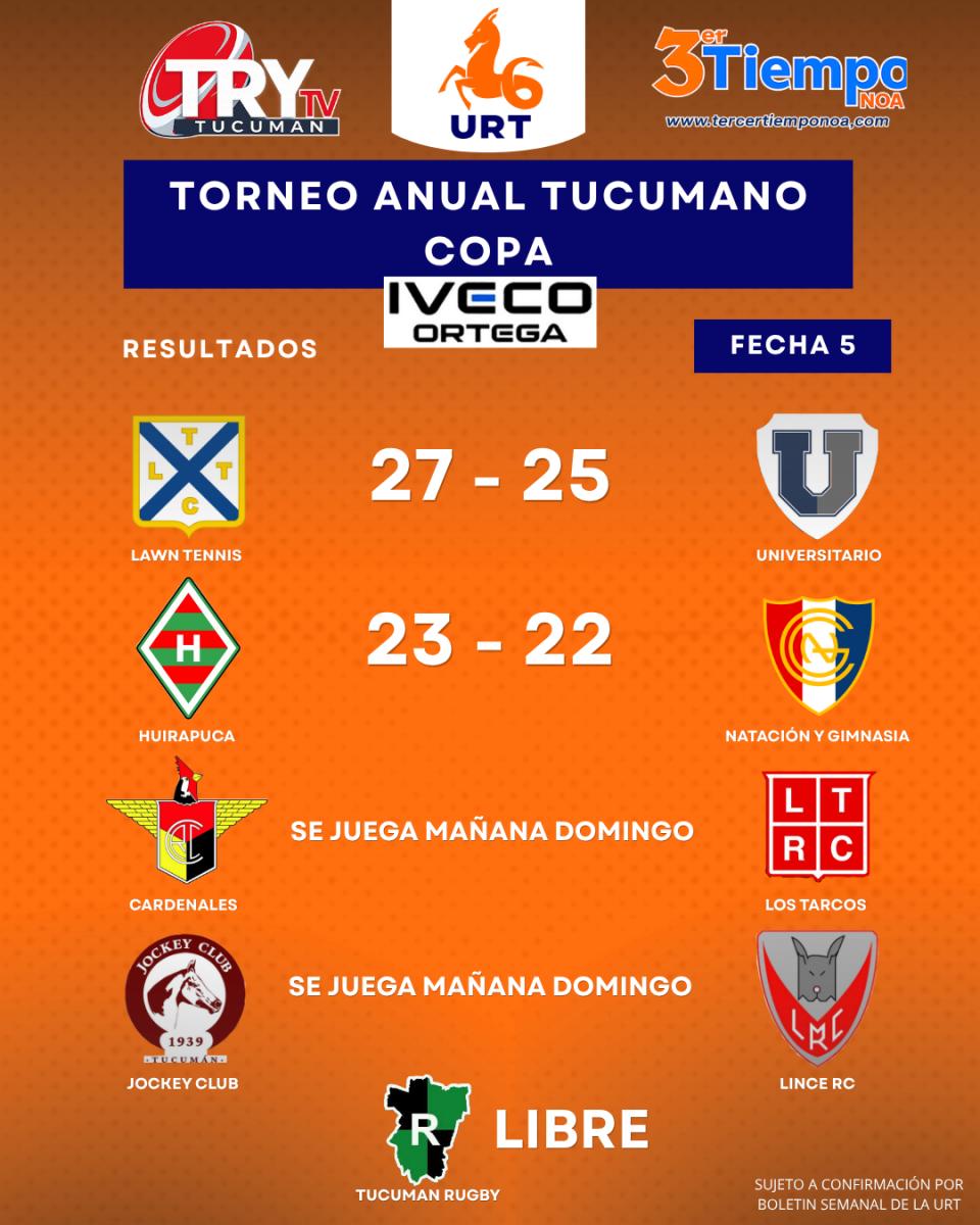 En la jornada sabatina, en Concepción, Huirapuca derrotó a Natación y Gimnasia, por un ajustado 23-22, mientras que en el parque 9 de Julio, Lawn Tennis venció a Universitario, en el clásico de la fecha, por 27 a 25.