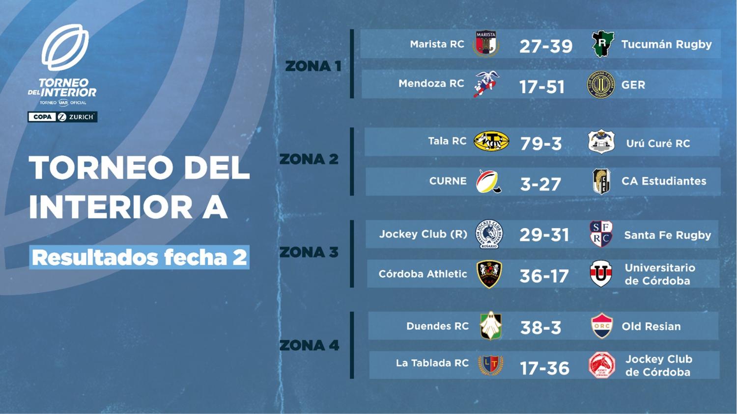 Por la Zona 2, en el duelo de cordobeses, Tala RC se despachó con un contundente 79-3 frente a Urú Curé. Asimismo, Estudiantes de Paraná cosechó su primer triunfo luego de doblegar por 27-3 a CURNE.